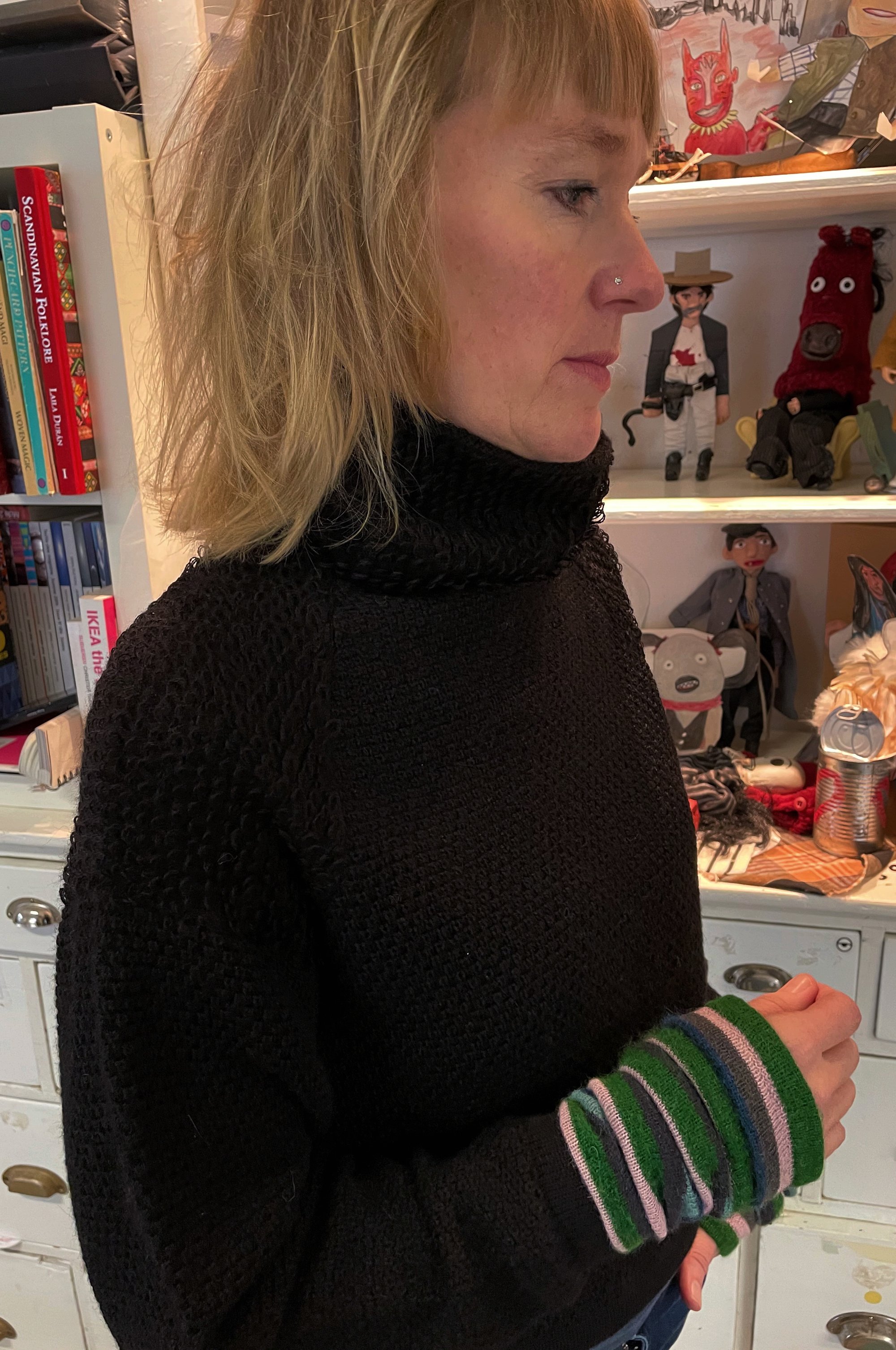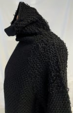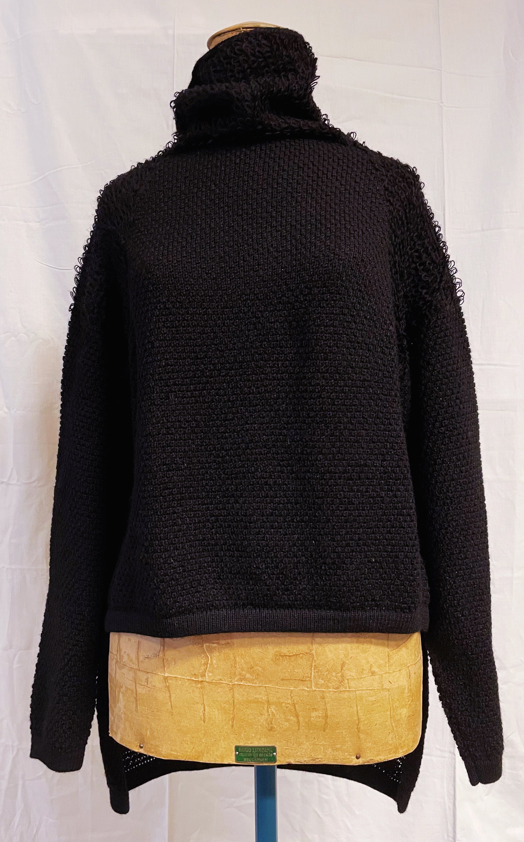 A warm and cosy sweater with a modern twist. The cut is straight and with a longer "tail" at the back. On the shoulders and collar there are loops that creates texture and adds details. Knitted in Bolivia in limited edition, collab with guest designer Camilla Boström.